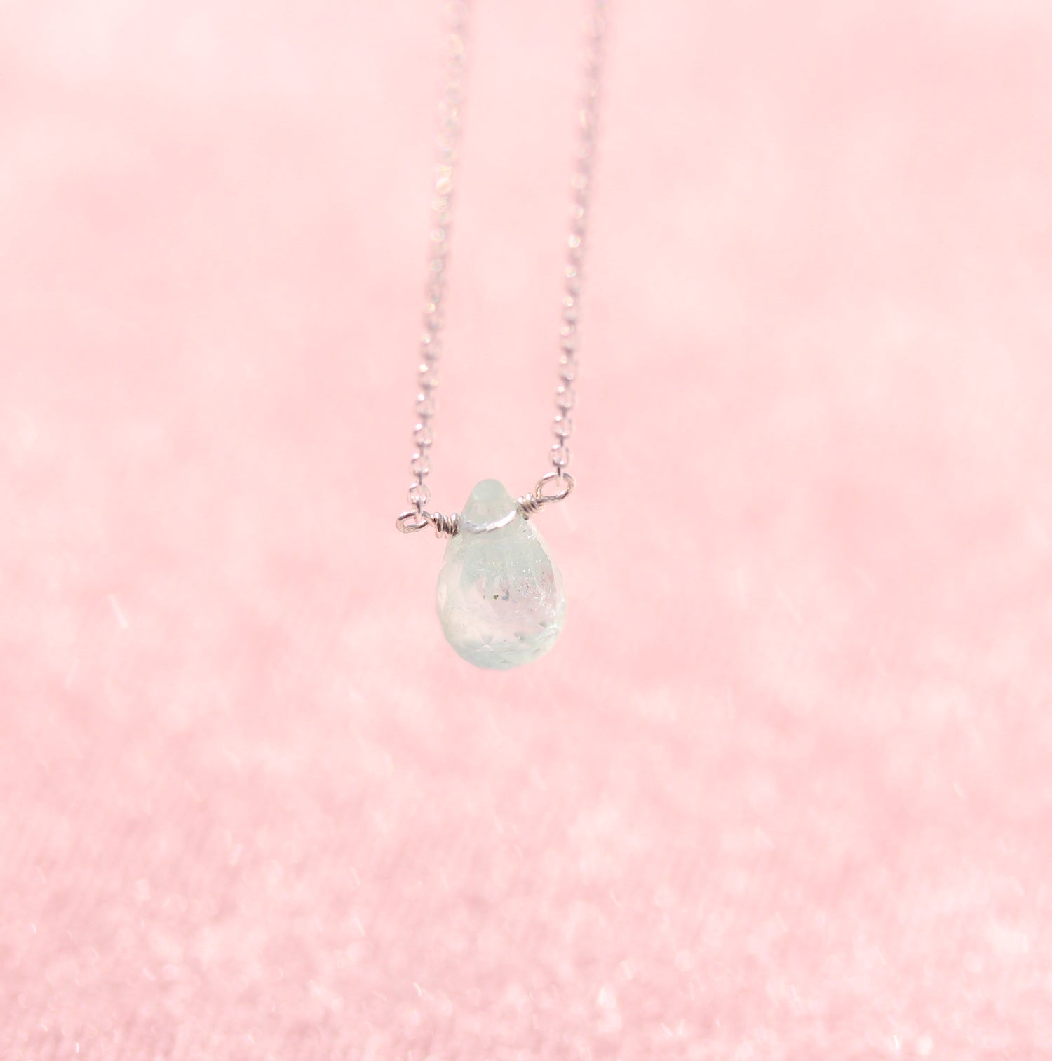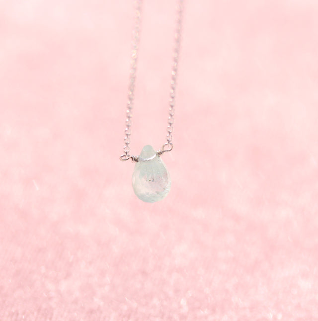 This faceted green amethyst briolette has the gentlest wash of colour, almost like early morning light or pale sea glass. Suspended from a fine 16” sterling silver chain, it sits delicately at the collarbone, catching the light with subtle movement.