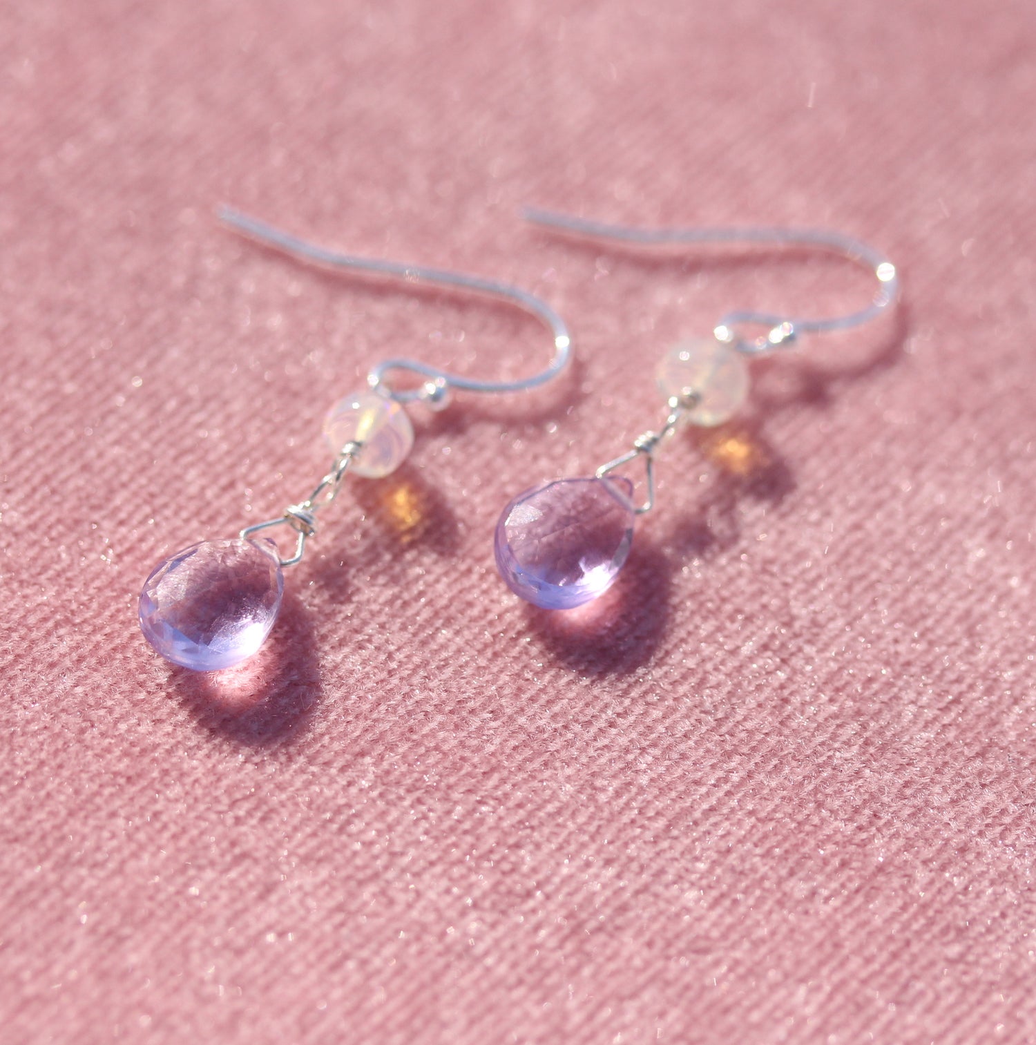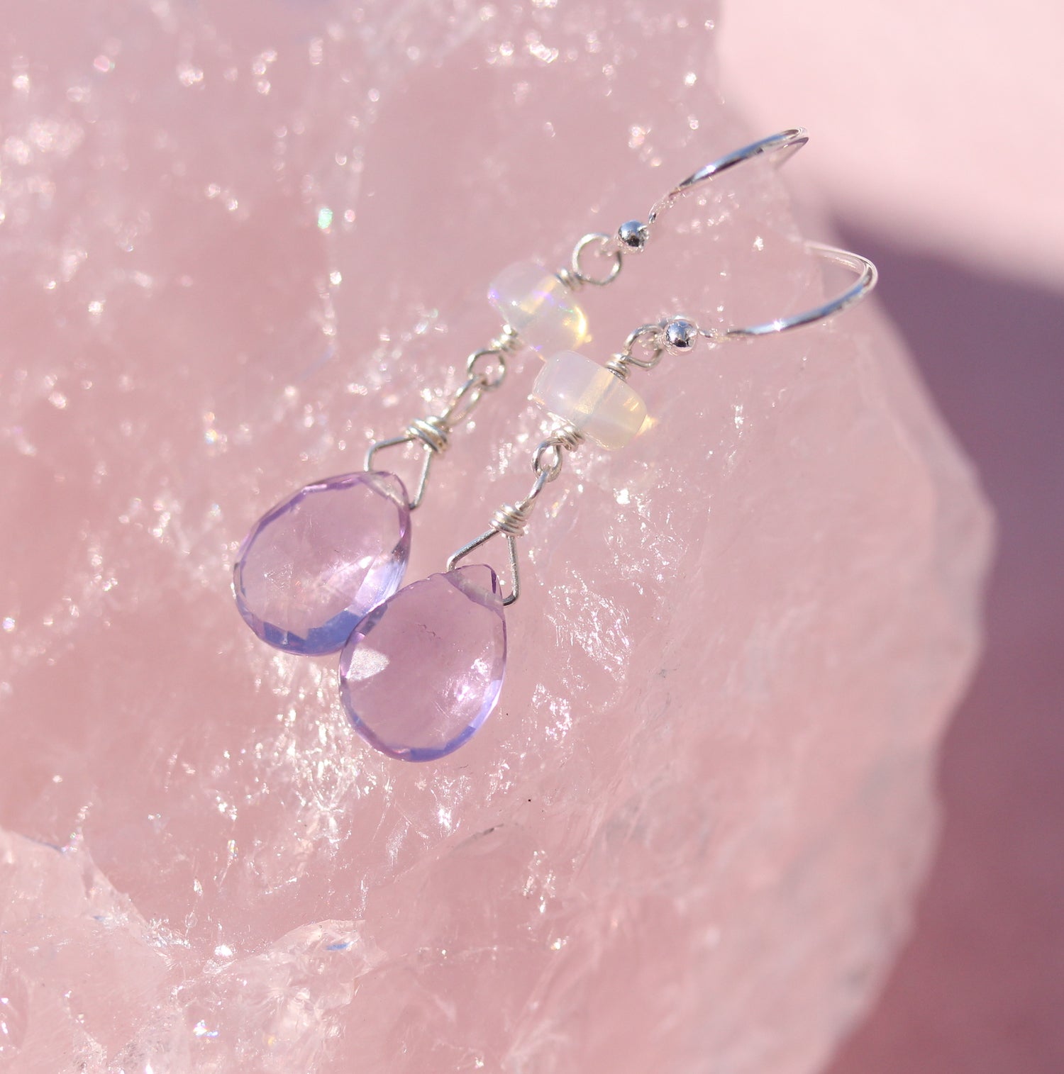 These earrings carry that soft shift in the air, pale lavender amethyst catching the light, paired with glowing opal that feels almost like morning dew. The colours are gentle and fresh, the kind that make you think of longer days and the first tiny signs of bloom.