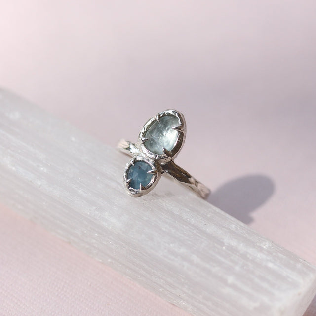 Featuring two rosecut aquamarine gemstones in organic shapes this ring is one-of-a-kind, just like you.