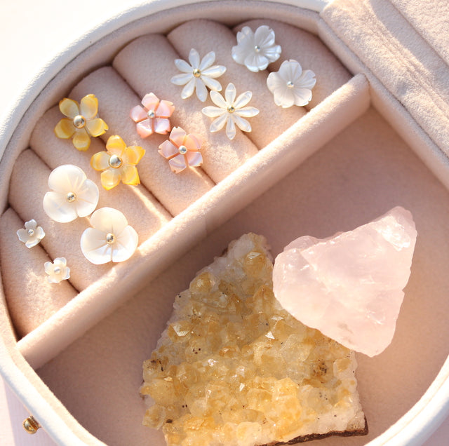 My love for flowers drew me to create sweet little studs with these gorgeous carved shell flowers.