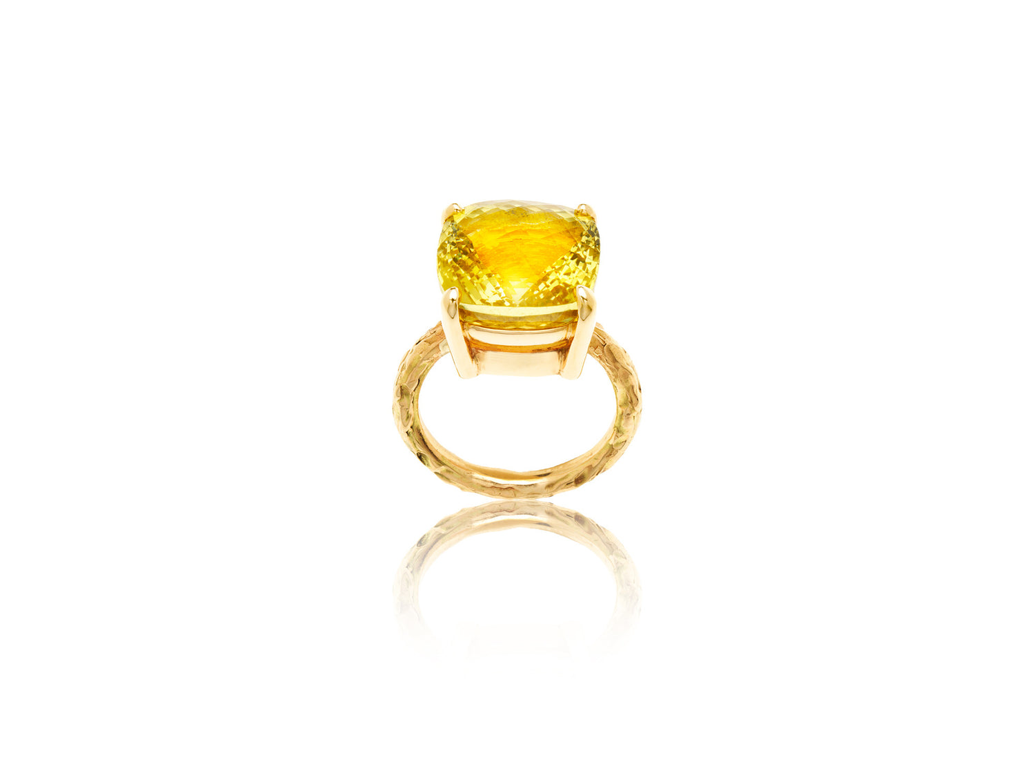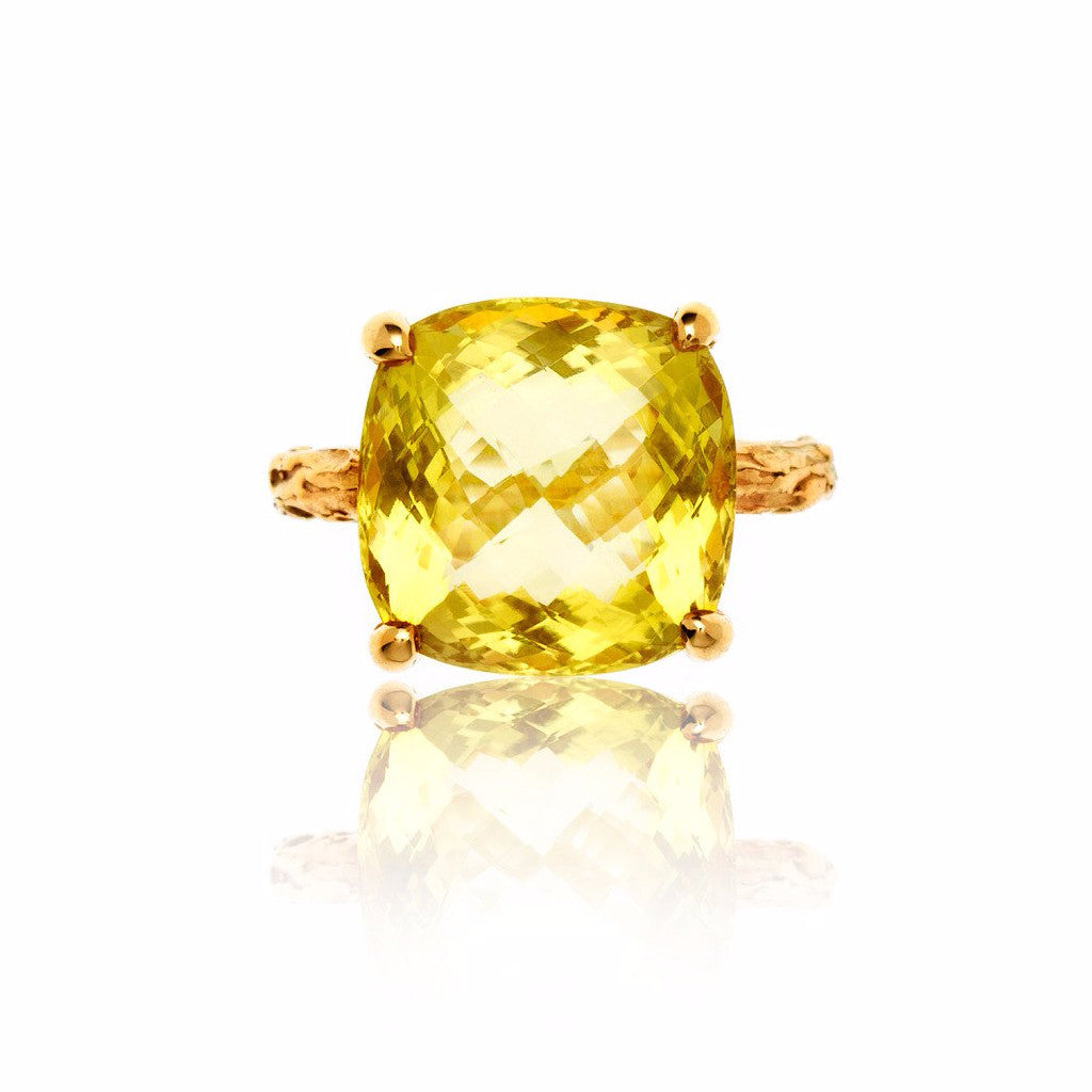 • This piece features a checkerboard cut lemon quartz cushion gemstone.