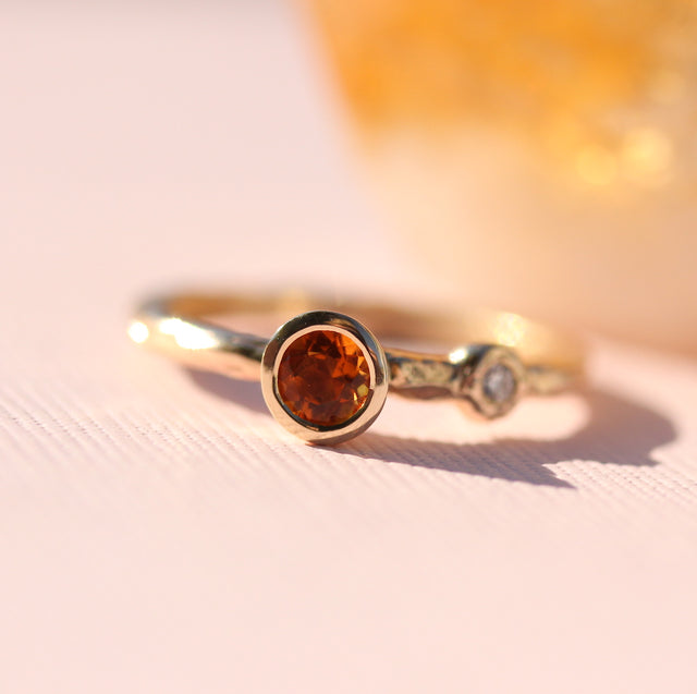 Featuring a deep citrine faceted gemstone and a small diamond set within the band.