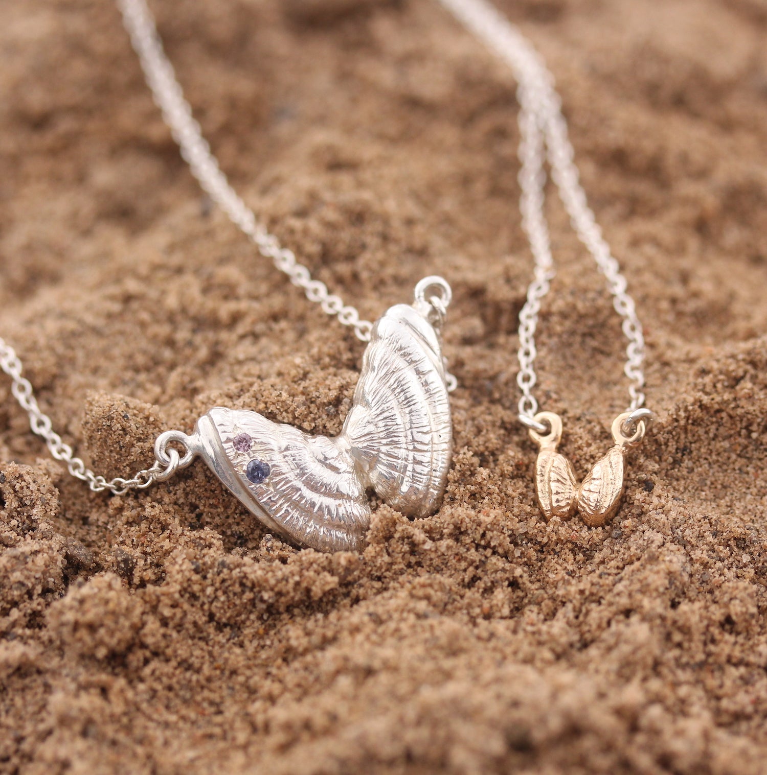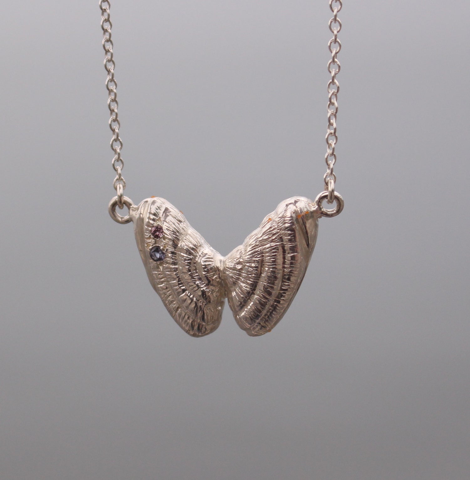 These necklaces were inspired by the Coquina shell aka "butterfly shell". Who remembers how exciting it was to find one that was fully in tact!? One of the large necklaces has a purple and pink sapphire to represent the beautiful purply/pink hue that's often found inside the shell.
