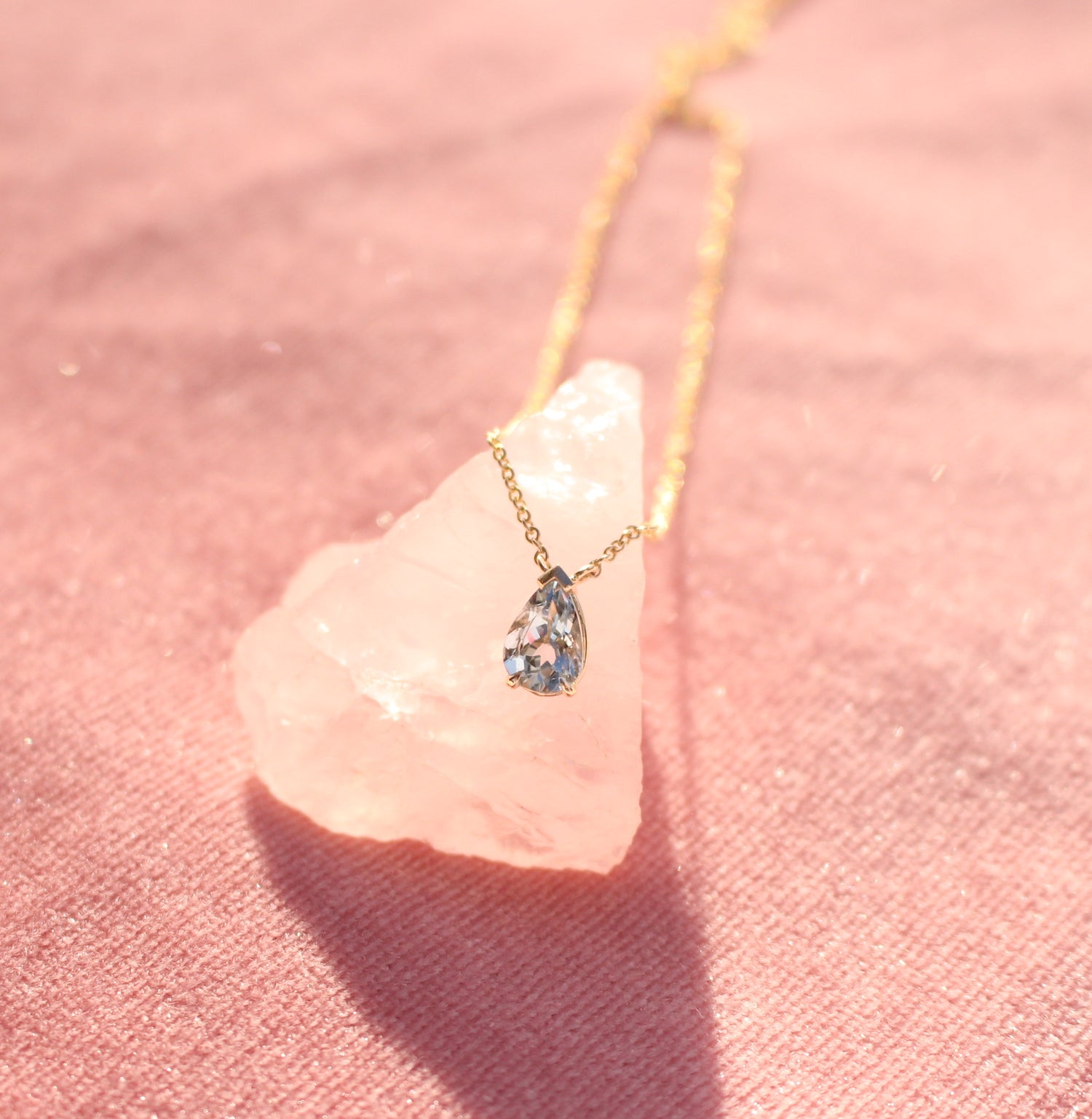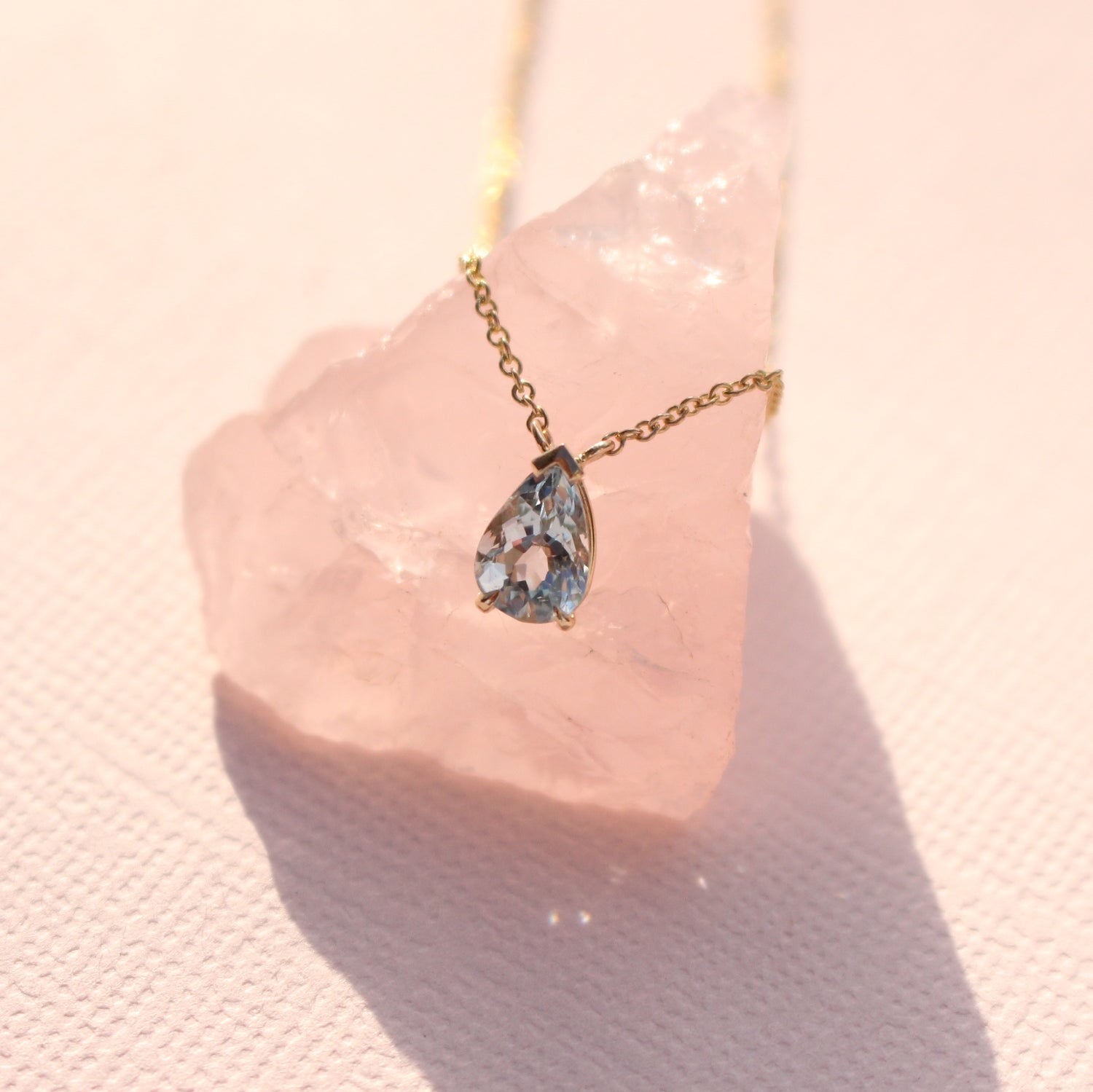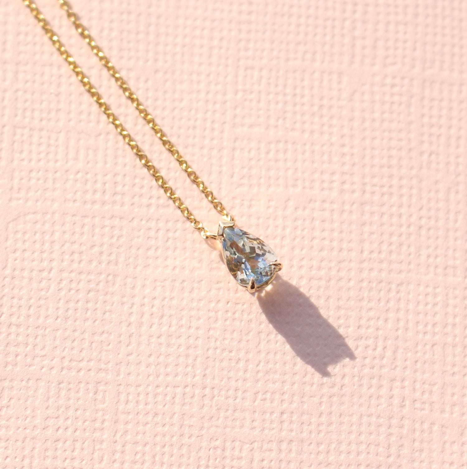 Soft, serene, and full of quiet sparkle — this necklace features a beautifully faceted pear-shaped aquamarine set in 14k yellow gold. The gentle blue catches the light in the sweetest way, suspended on a fine gold chain for an effortless, everyday feel.
