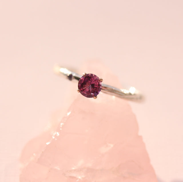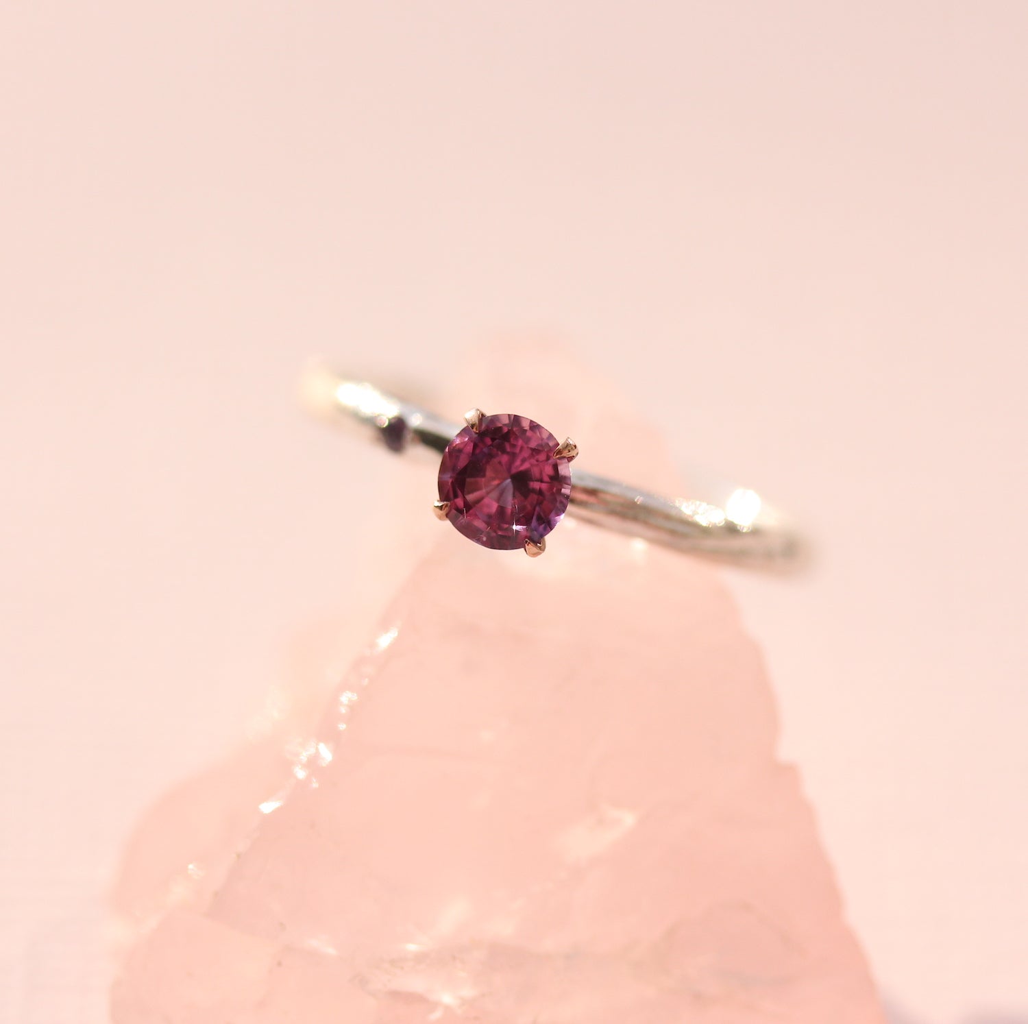 This one-of-a-kind ring features a glowing Berry Sapphire set in a warm rose gold setting on a hand-carved sterling silver band. The sapphire’s soft pink-violet hue brings a gentle pop of colour, and a small deep purple sapphire set into the band adds a subtle, unexpected touch of richness.