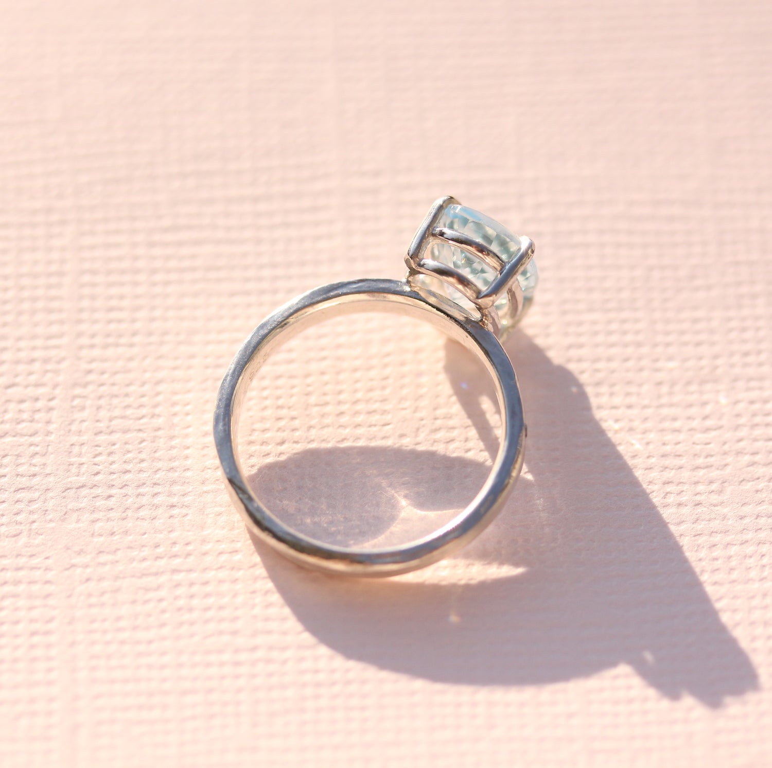 Inspired by the stillness and shimmer of water, this pale blue topaz ring captures the feeling of sunlight reflecting on gentle waves. The oval-cut topaz glows with soft sky-blue tones, while the band — carved entirely by hand — carries a subtle ripple texture that mirrors the movement of water.