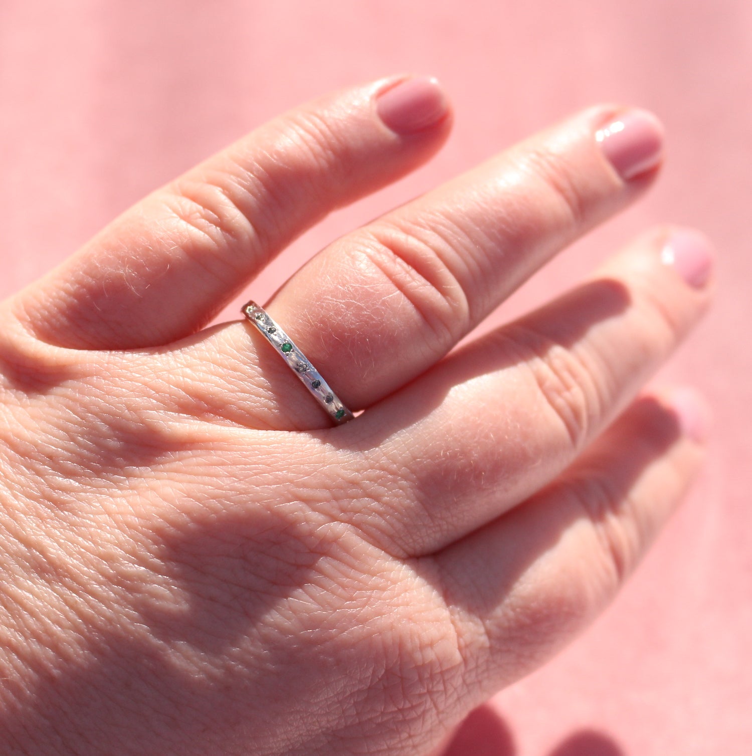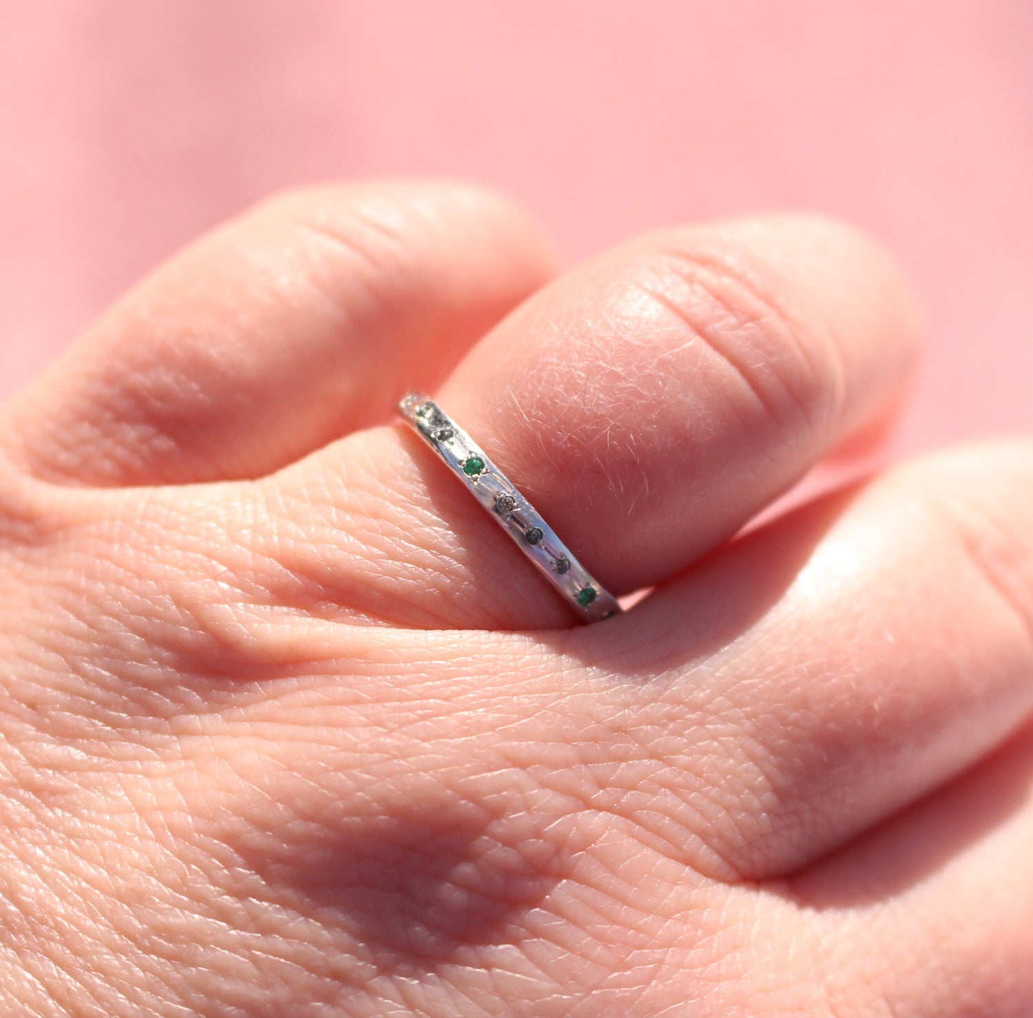 Delicate and quietly detailed, this band features a hand-carved water texture that wraps gently around the ring, catching the light like ripples on the surface of a lake. Tiny bead-set teal sapphires and emeralds are scattered along the band, adding a subtle shimmer.