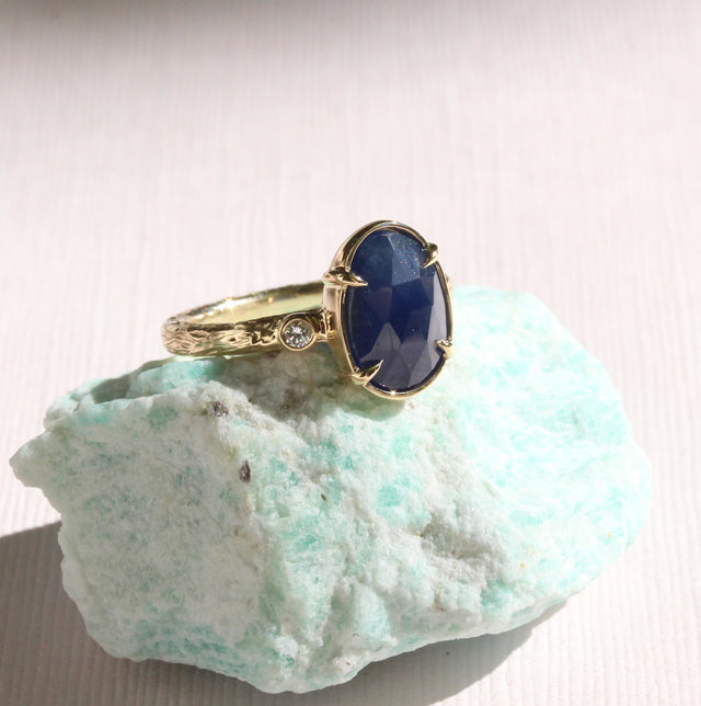 • This ring is one-of-a-kind. Each rose cut sapphire is slightly different which means once this piece finds a home it can not be replicated.