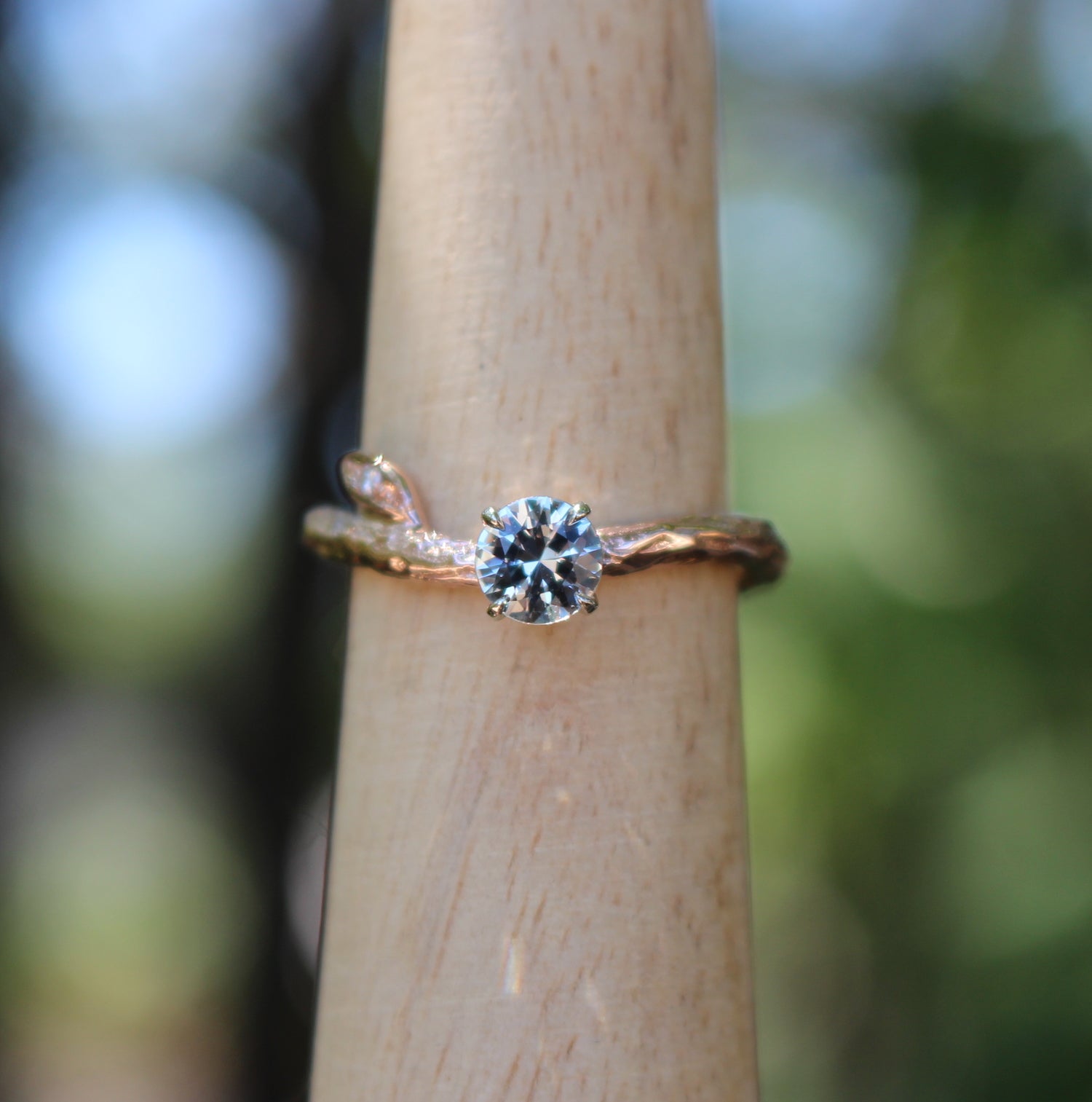 With its organic branch-textured band in 14k rose gold and a 14k white gold setting, this ring is both nature-inspired and timeless. It reimagines the classic solitaire engagement ring with a touch of seasonal magic—perfect as a unique engagement ring or a meaningful “treat yourself” piece.