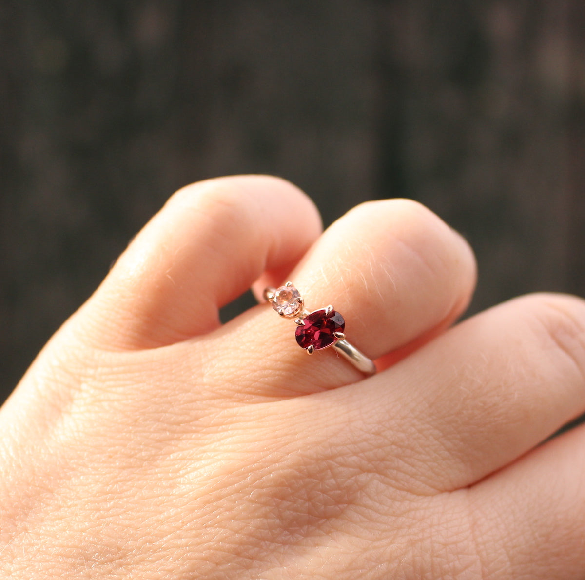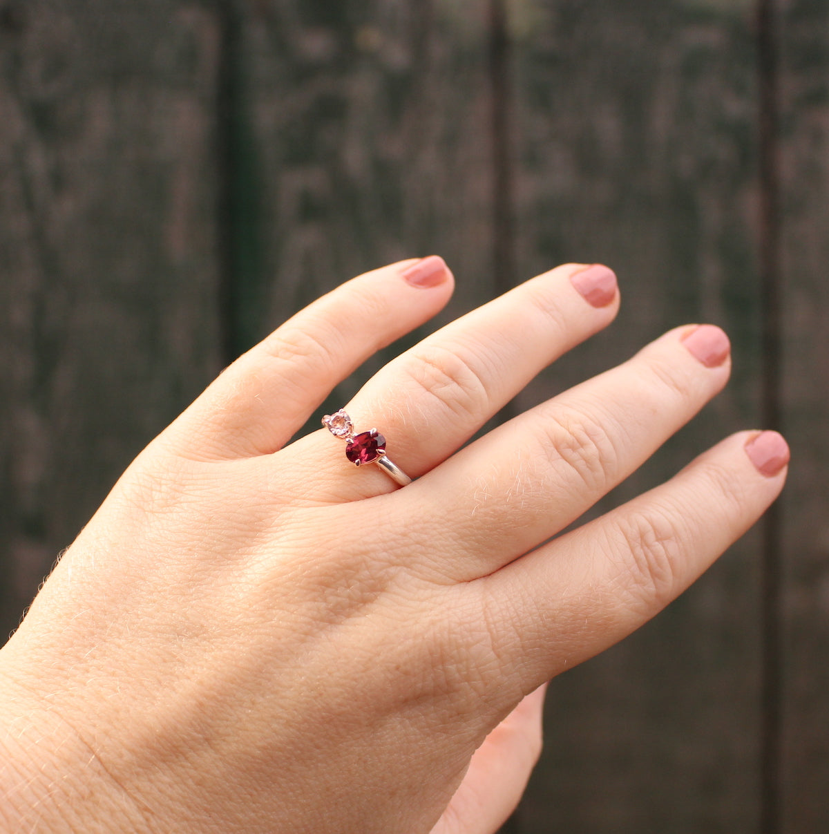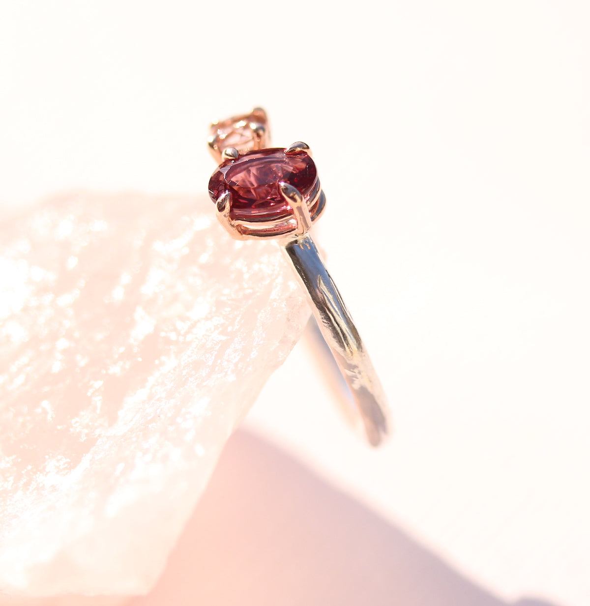 Featuring a deep berry toned garnet gemstone and small pale pink morganite set in 14k rose gold settings with a sterling silver band.