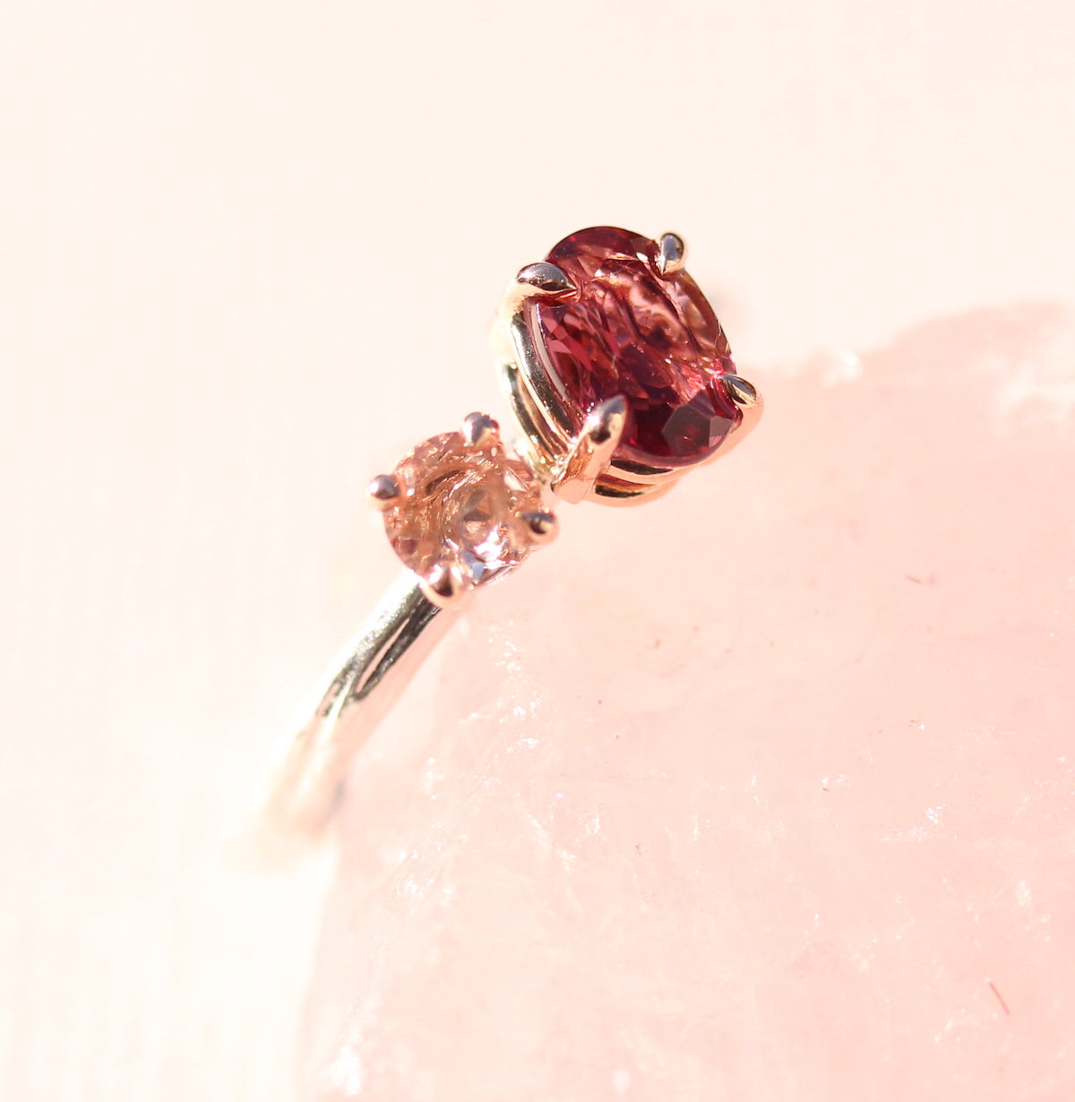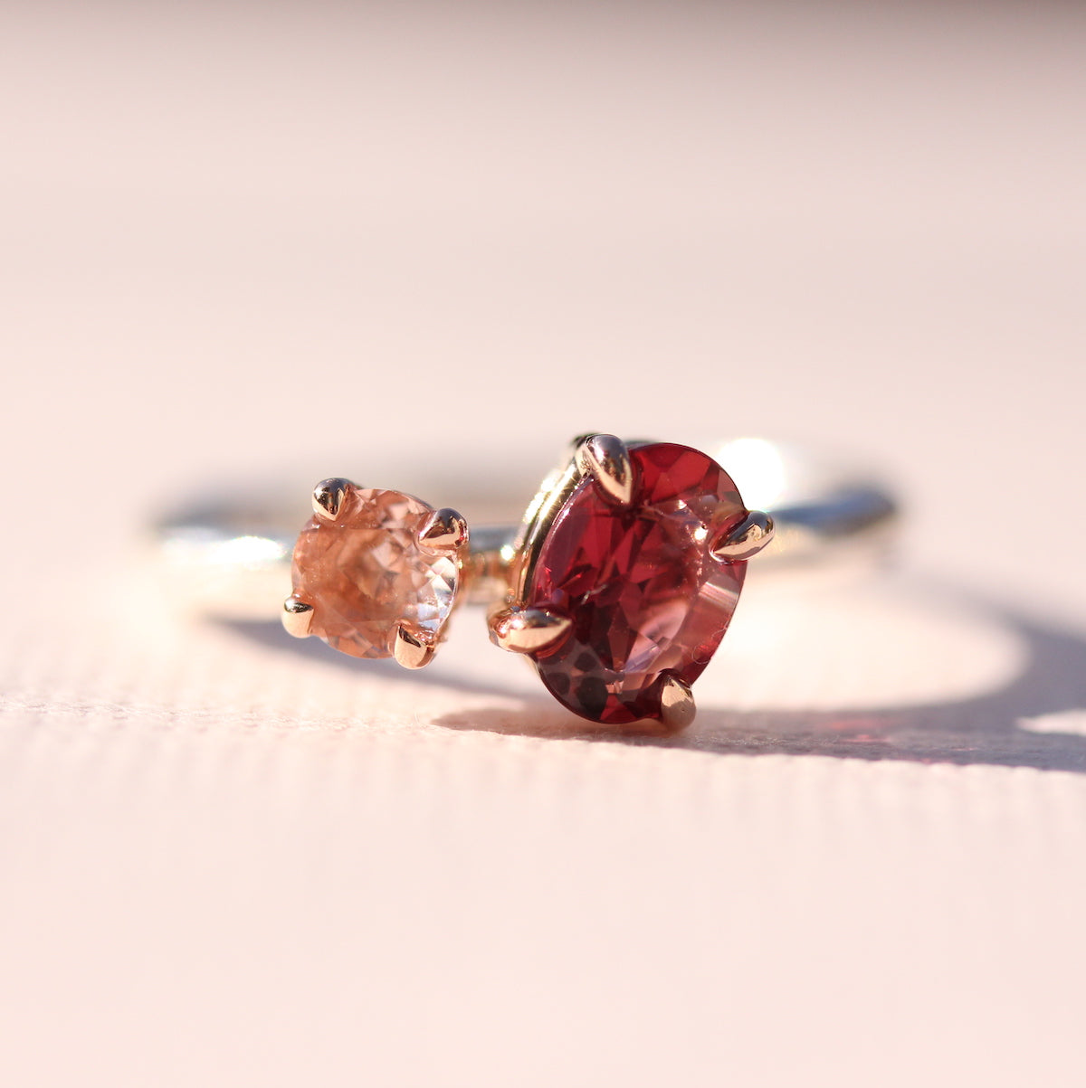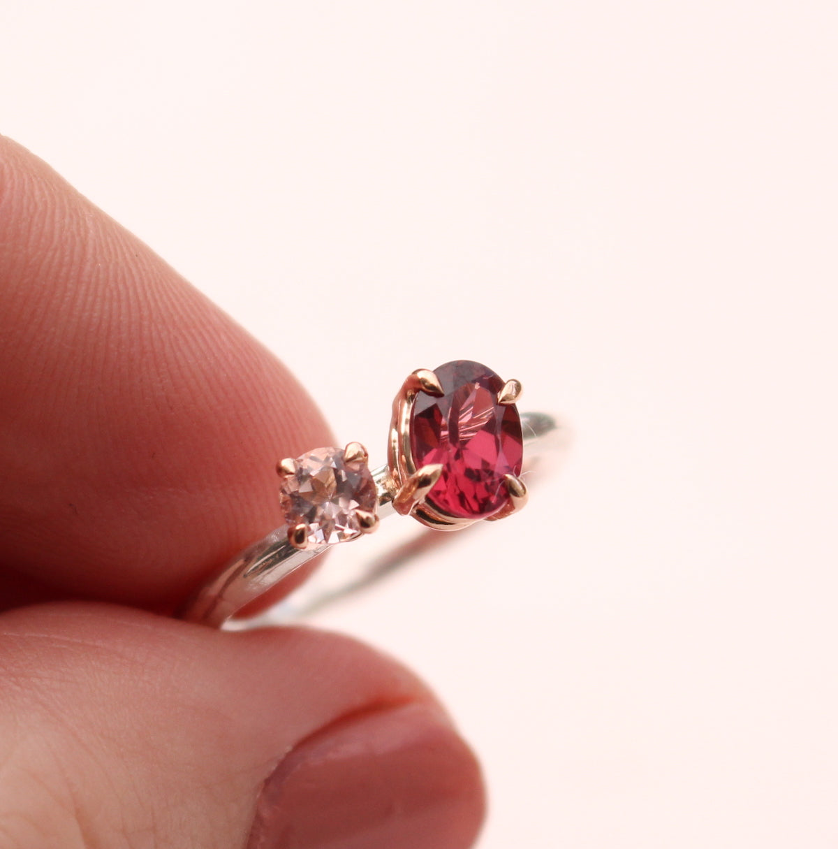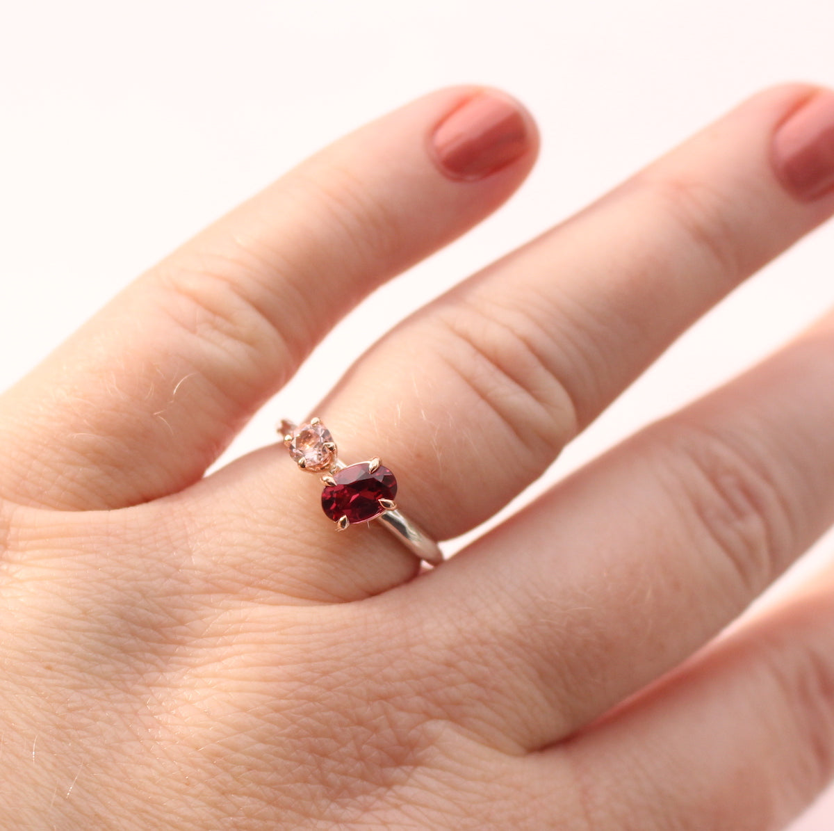 Featuring a deep berry toned garnet gemstone and small pale pink morganite set in 14k rose gold settings with a sterling silver band.