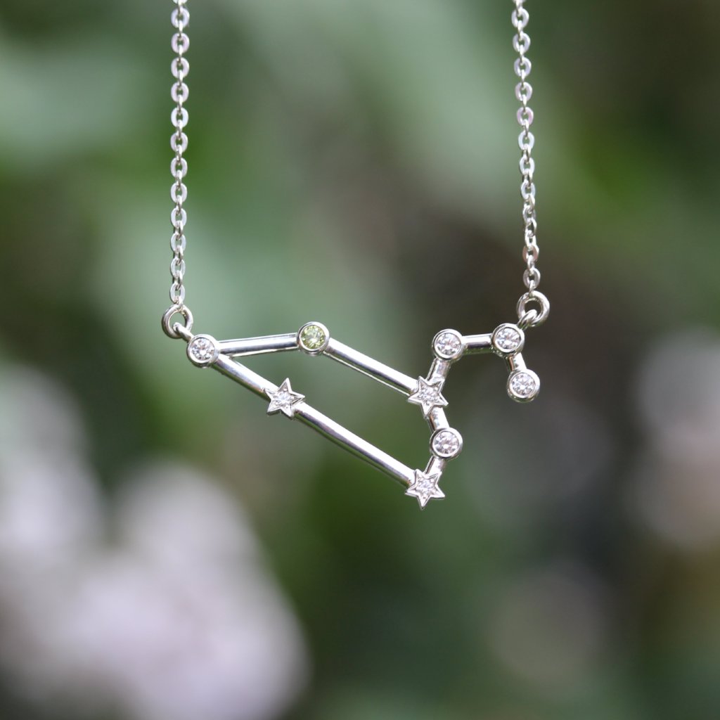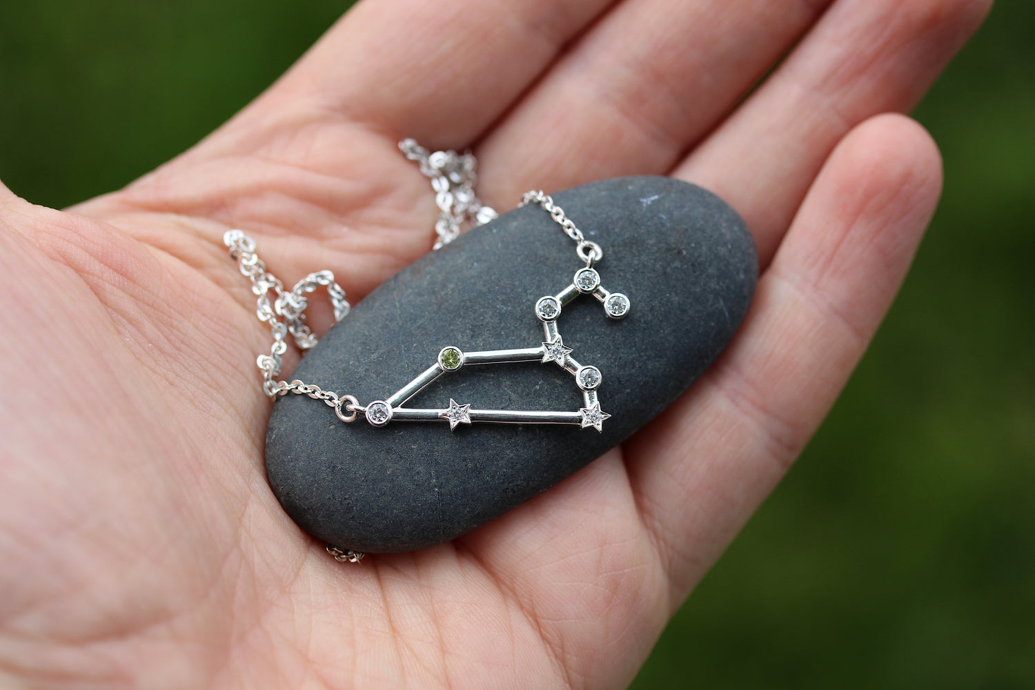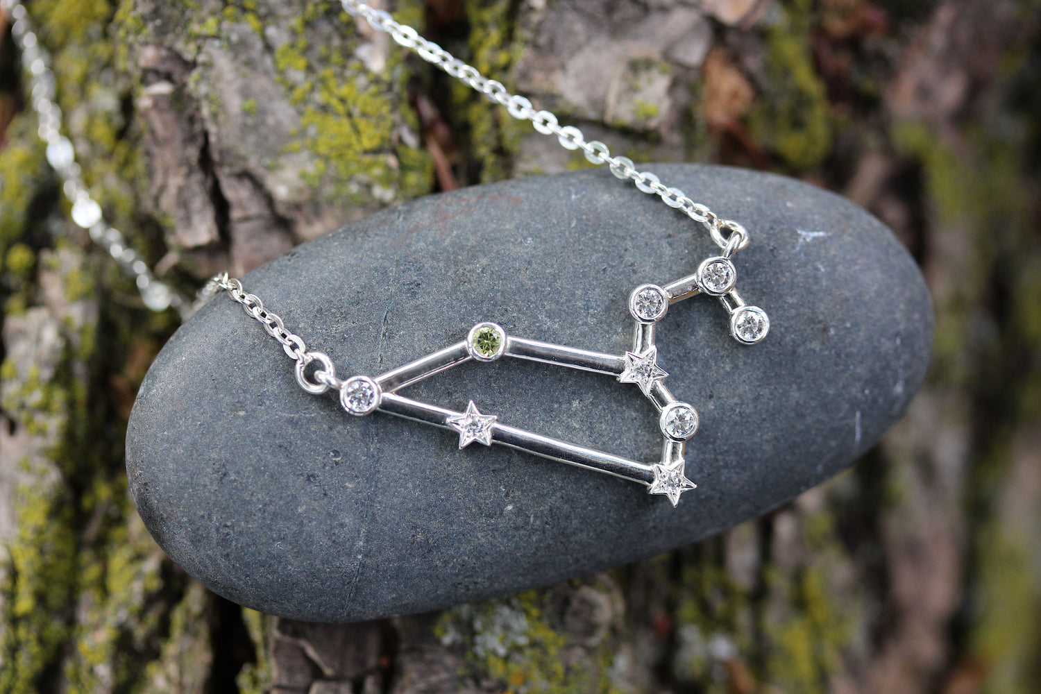 Details: I made this beautiful star constellation for L who is a Leo! We put a small peridot in it which is the birthstone for August ( just to make it extra personalized and representational)