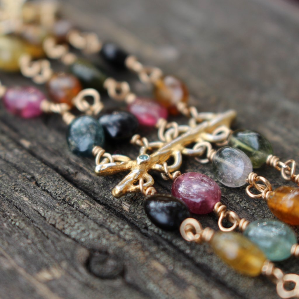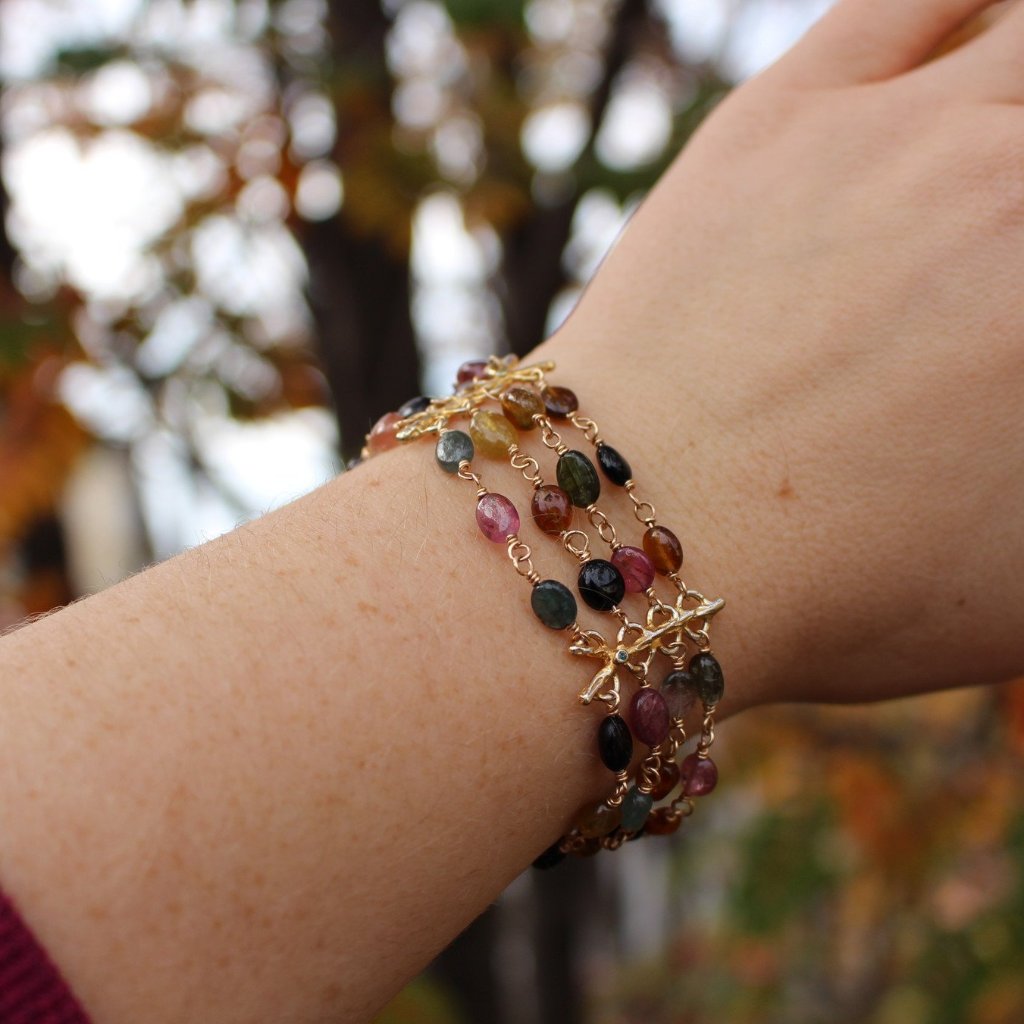 This four strand piece features 3 cast branch elements with peridot and green diamond set within the knots. The branches are cast in sterling silver and plated with yellow gold in the recessed areas in order to add depth to the piece. Each tourmaline is wire wrapped and their placement was chosen to ensure not two of the same shade are beside one another. The beauty is in the details.